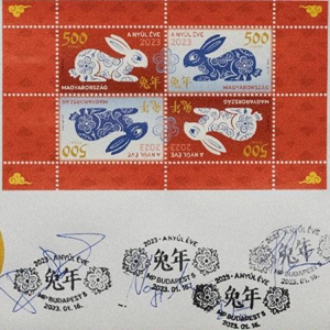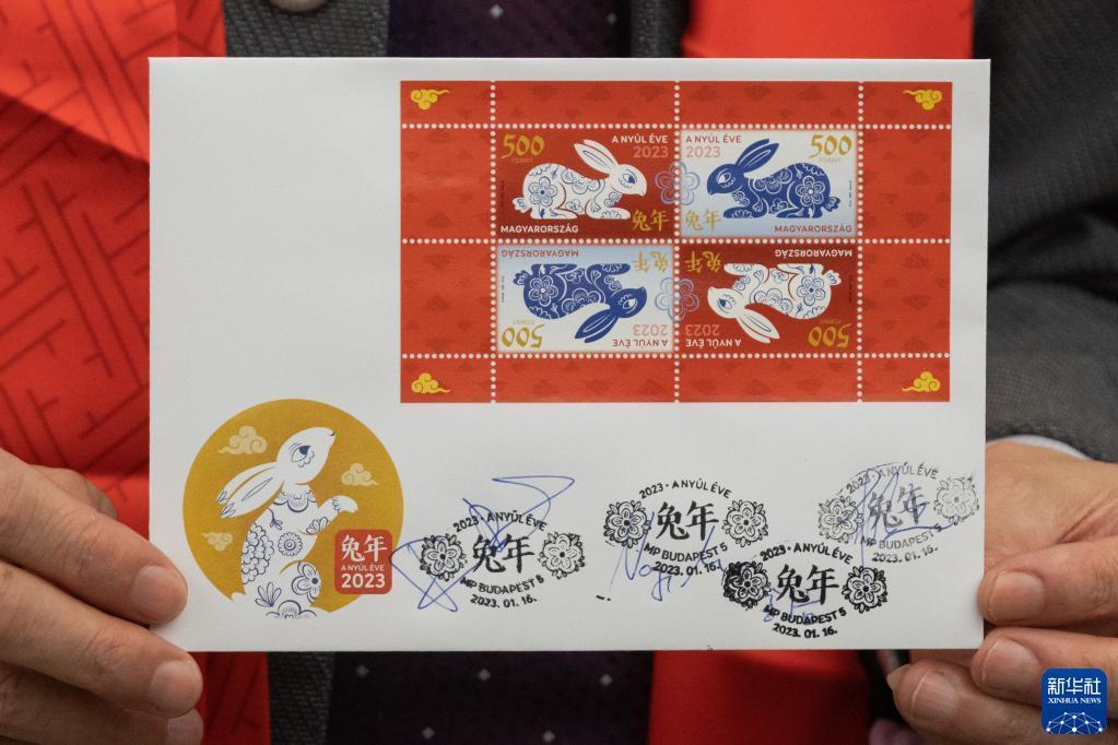 中國駐匈牙利大使館、匈牙利經(jīng)濟發(fā)展部、布達佩斯中國文化中心與匈牙利郵政局16日在匈牙利郵票博物館共同舉行中國農歷兔年生肖郵票發(fā)行儀式。此次發(fā)行的兔年生肖郵票由匈牙利平面藝術(shù)家毛羅什·克里斯蒂娜設計,共發(fā)行2萬(wàn)枚小型張,每枚小型張由4枚郵票構成。郵票采用四角對稱(chēng)構圖方式,以紅白兩色為背景,描繪了與青花瓷同色調的兩對小兔子,并以中匈兩國文字標識出“兔年”主題。