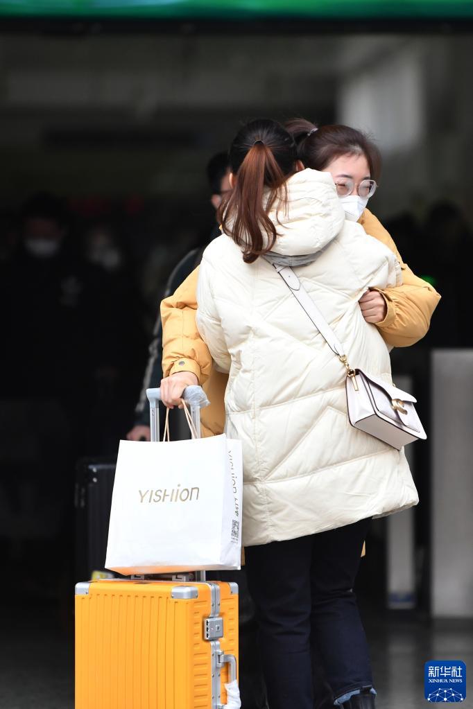 1月16日,在蘭州火車(chē)站西出站口,從烏魯木齊回家過(guò)年的鞏尕尕(后)與前來(lái)接站的姐姐擁抱。新華社記者 陳斌 攝