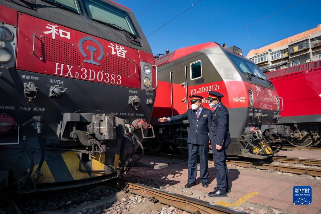 1月15日,丁建華(左)給徒弟姜庭瑞介紹火車(chē)頭相關(guān)知識。