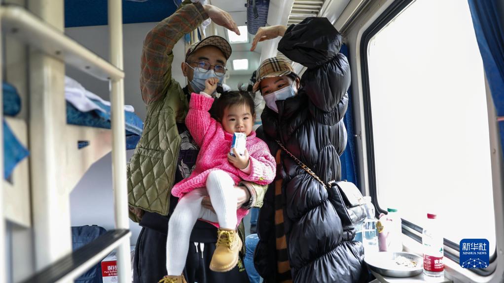 1月16日,在開(kāi)往冊亨的綠皮火車(chē)臥鋪車(chē)廂,返鄉的一家三口在車(chē)上合影。