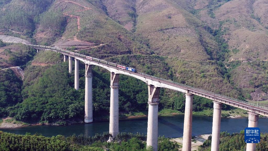 1月16日,一列綠皮火車(chē)經(jīng)過(guò)八渡南盤(pán)江鐵路橋開(kāi)往冊亨站(無(wú)人機照片)。