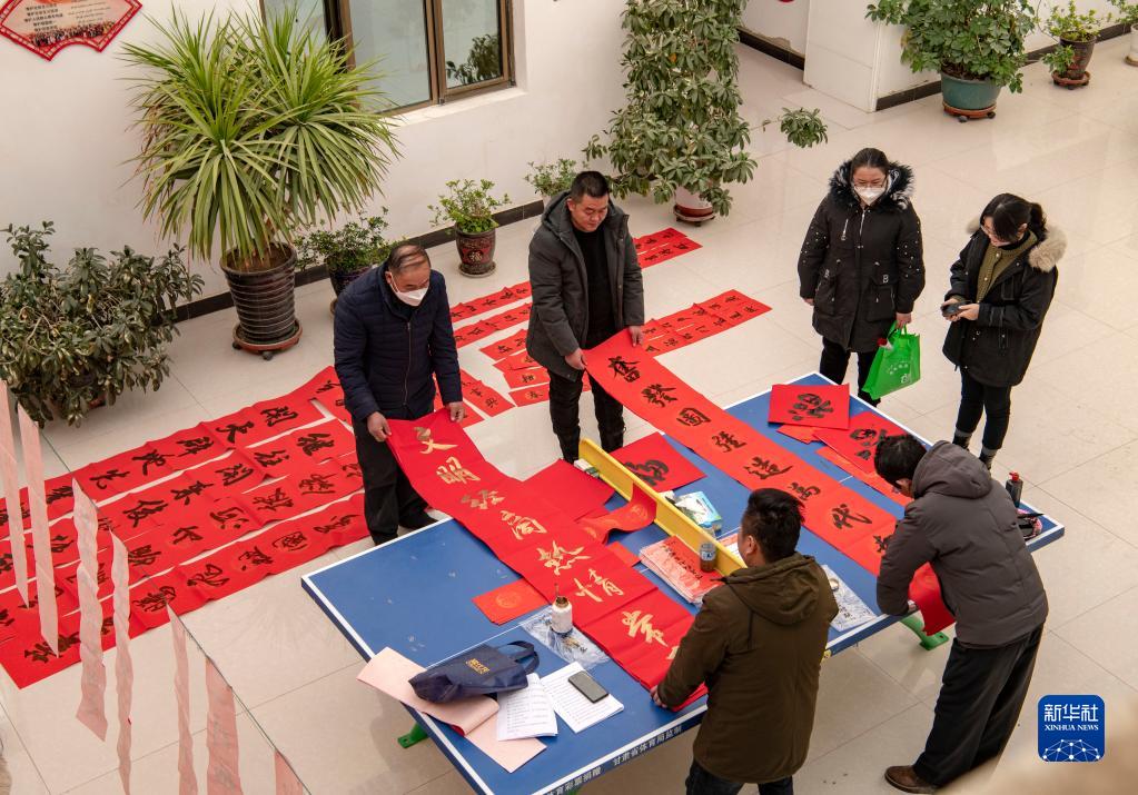 1月17日,在甘肅省酒泉市阿克塞哈薩克族自治縣阿克旗鄉舉辦的“書(shū)寫(xiě)春聯(lián)送祝福、勤儉文明迎新春”新時(shí)代文明實(shí)踐活動(dòng)上,文化志愿者為群眾現場(chǎng)寫(xiě)春聯(lián)。