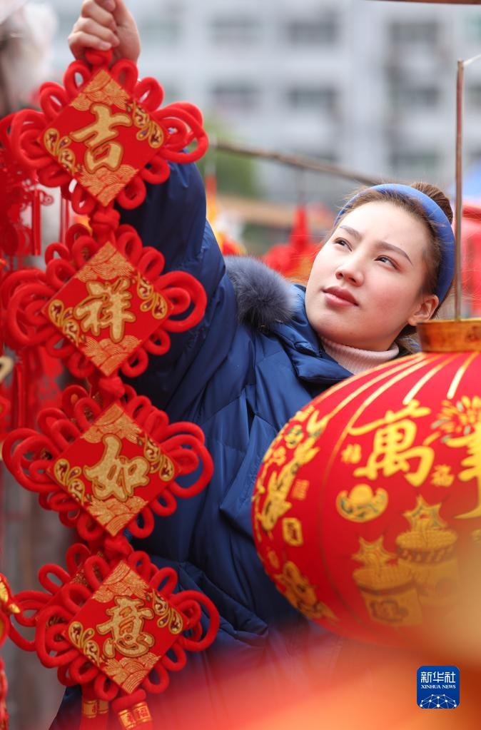 1月17日,在湖南省懷化市通道侗族自治縣雙江鎮城東年貨市場(chǎng),人們在選購春節飾品。