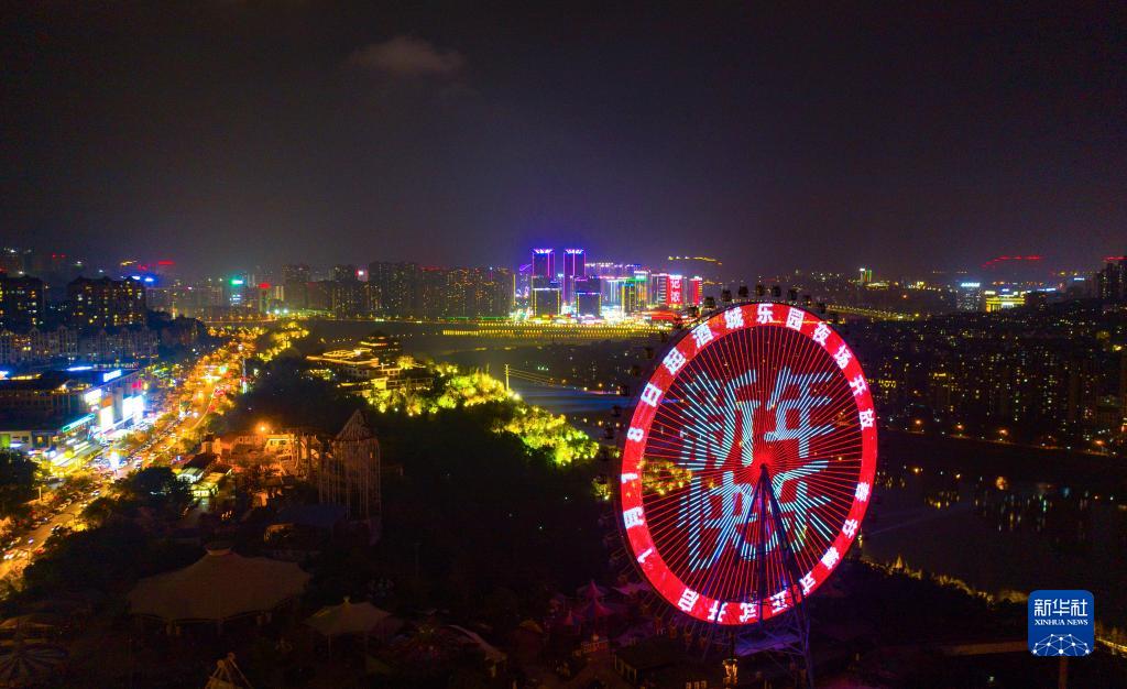 四川省瀘州市江陽(yáng)區的摩天輪點(diǎn)亮新年問(wèn)候(無(wú)人機照片,1月16日攝)。
