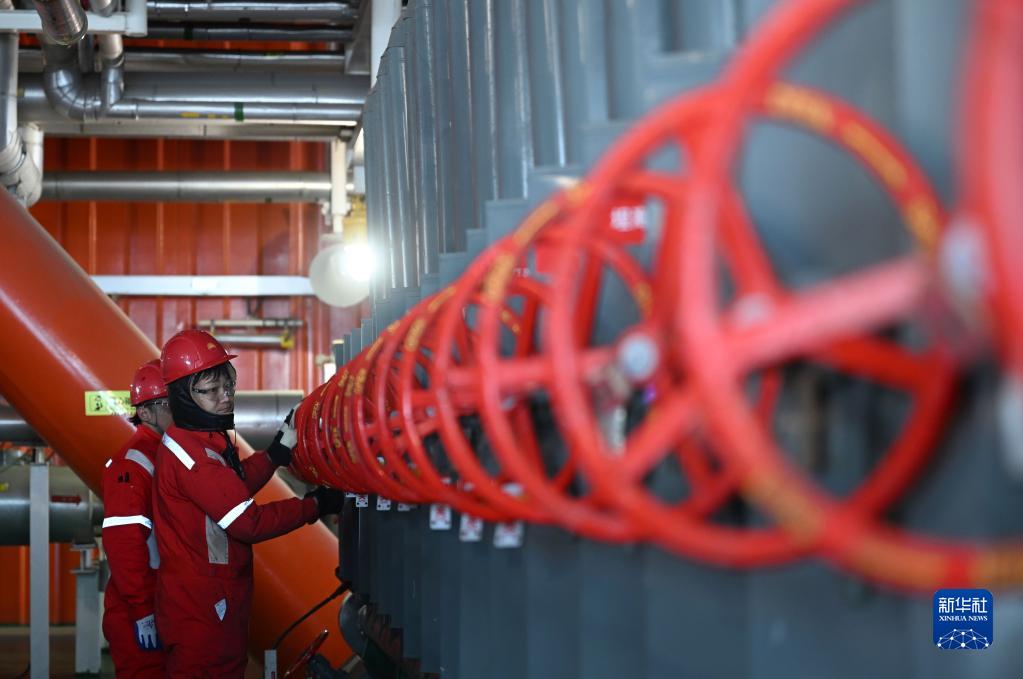 埕海一號海上采油平臺采油工在進(jìn)行油井生產(chǎn)與計量作業(yè)(1月16日攝)。