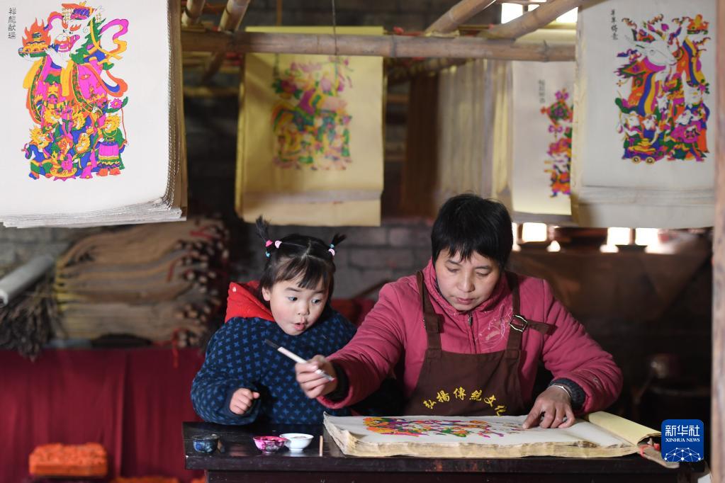 1月17日,在灘頭鎮福美祥年畫(huà)作坊,年畫(huà)藝人尹冬香在年畫(huà)上加入手繪,她的孫女在一旁觀(guān)看。