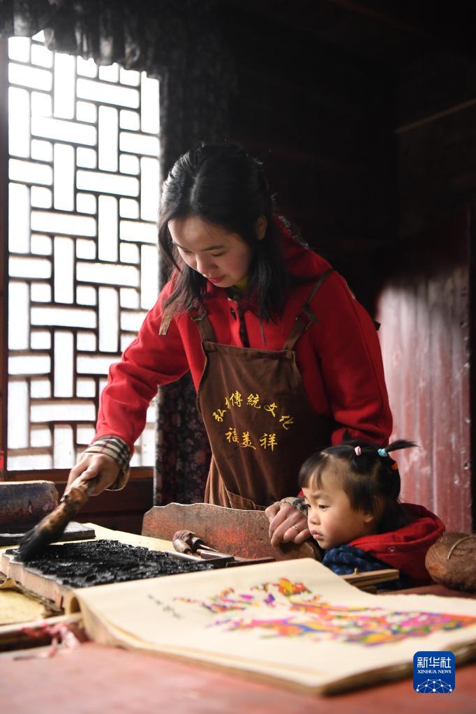春節臨近,湖南省邵陽(yáng)市隆回縣灘頭鎮的木版年畫(huà)作坊加班加點(diǎn)趕制年畫(huà),供應春節市場(chǎng)。