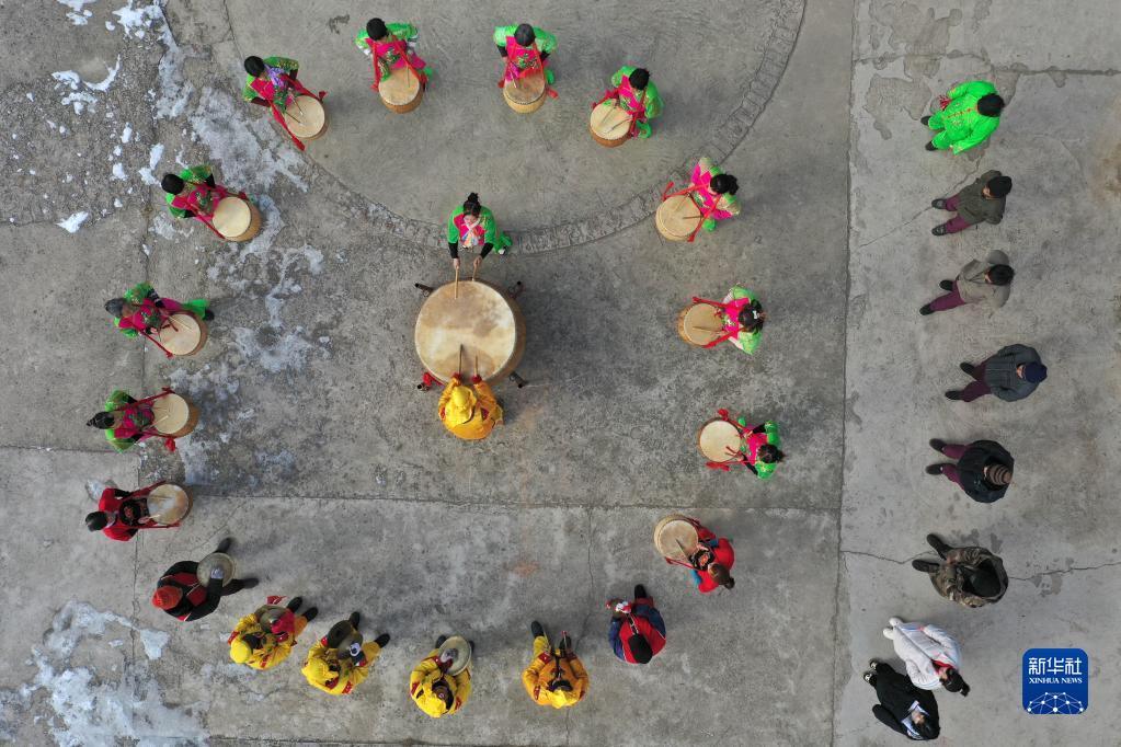 1月17日,內陽(yáng)村村民排練“威風(fēng)鑼鼓”節目(無(wú)人機照片)。
