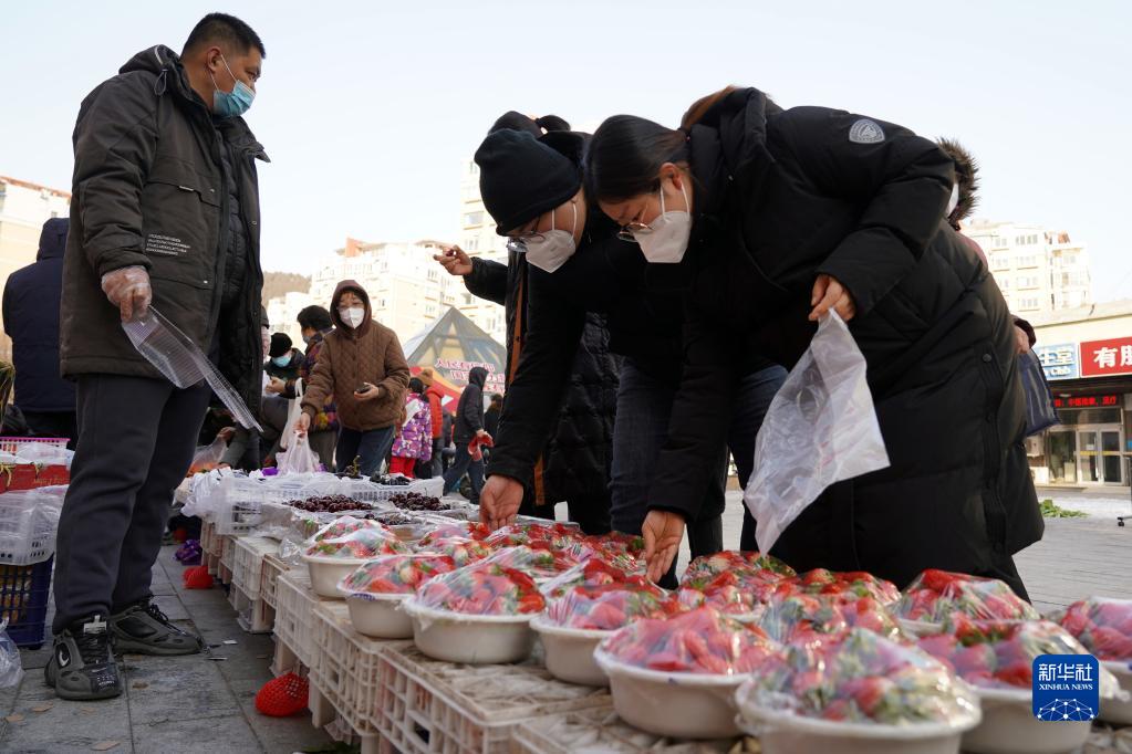1月17日,在濟南市舜雅社區年貨大集上,居民在選購草莓。