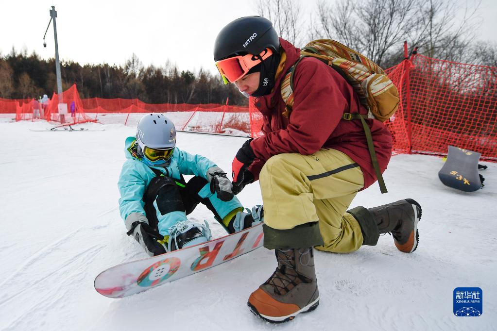 都軒銘(左)在父親都宇的幫助下調整單板固定器(2023年1月14日攝)。