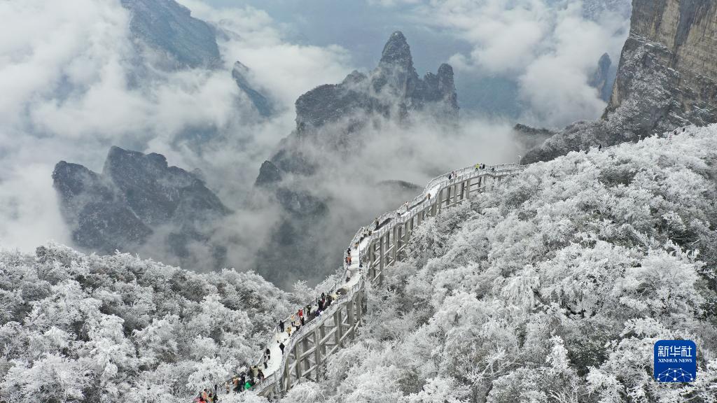 1月16日,游客在湖南省張家界天門(mén)山風(fēng)景區觀(guān)賞雪后美景(無(wú)人機照片)。