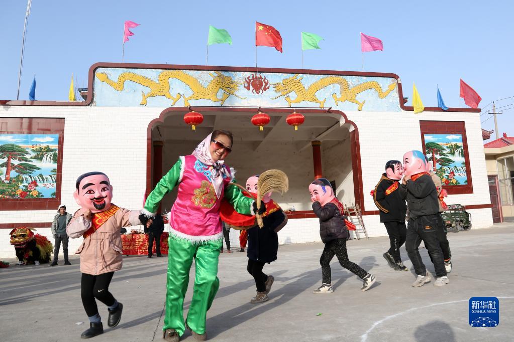 1月18日,甘肅省平?jīng)鍪嗅轻紖^四十里鋪鎮洪岳村社火隊在村文化廣場(chǎng)排練社火節目。