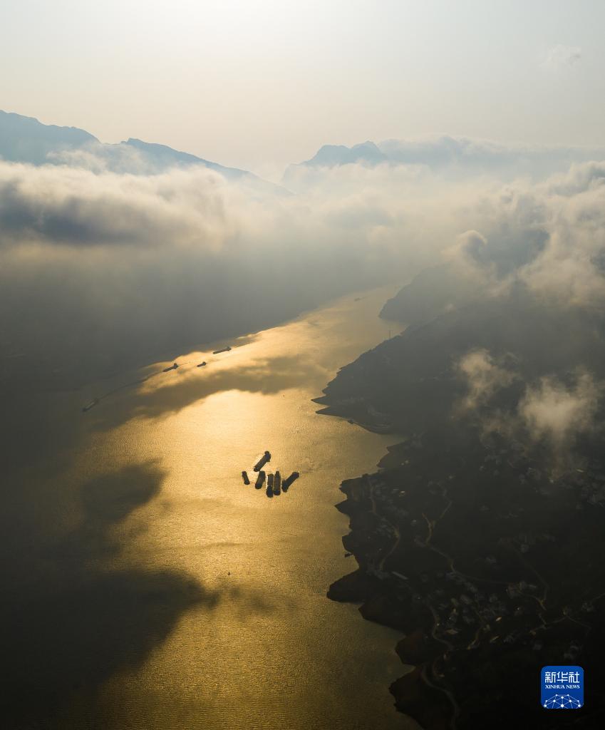 1月18日,船舶行駛在長(cháng)江三峽湖北省宜昌市秭歸縣水域(無(wú)人機照片)。
