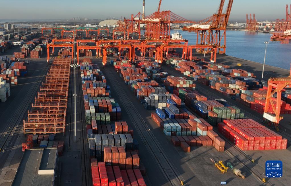 1月15日拍攝的唐山港京唐港區集裝箱碼頭貨場(chǎng)(無(wú)人機照片)。