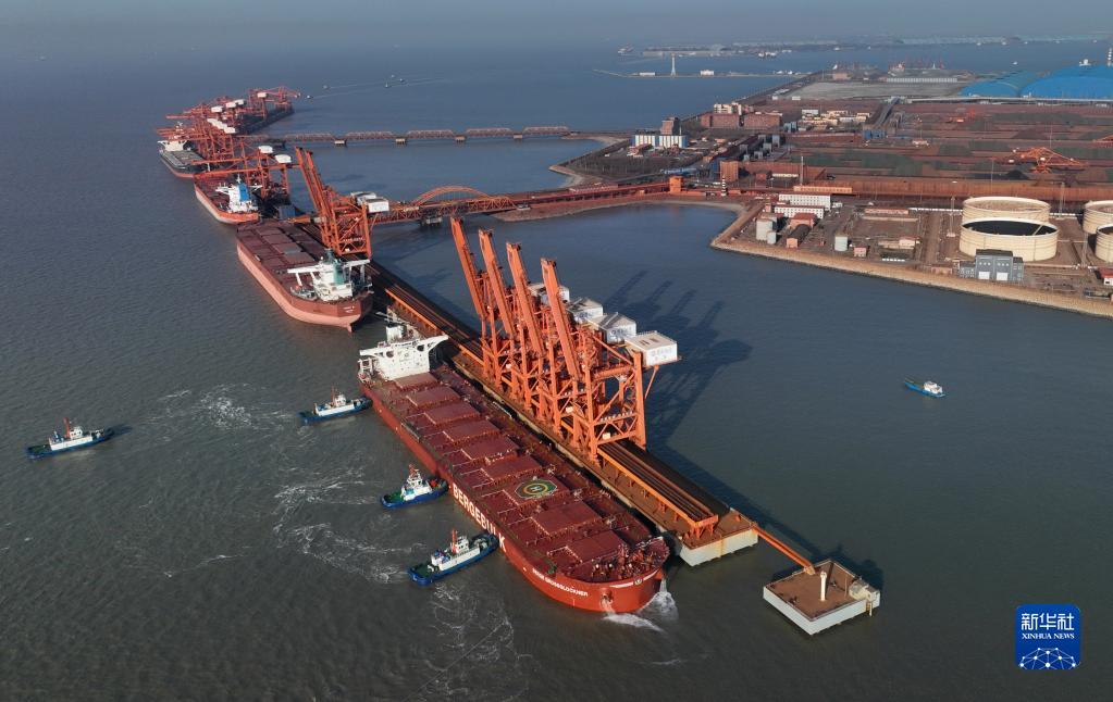 1月18日,一艘輪船在拖輪的協(xié)助下向唐山港曹妃甸港區礦石碼頭靠泊(無(wú)人機照片)。