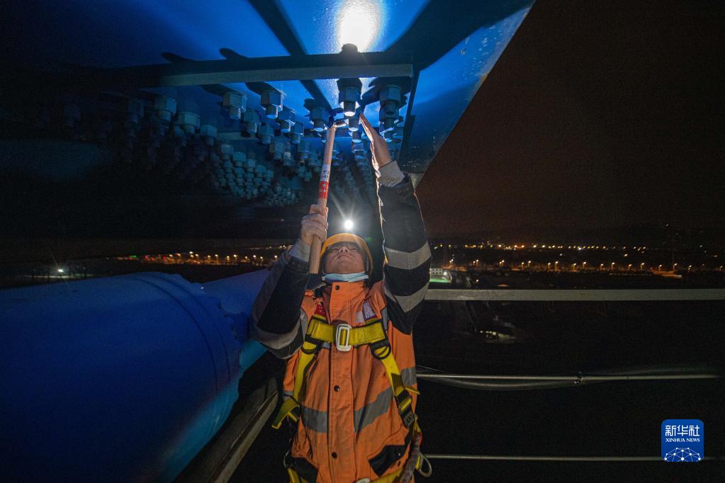 近日,浙江省迎來(lái)降溫天氣。鐵路寧波工務(wù)段椒江橋隧工區的工人們利用夜間高鐵線(xiàn)路的“天窗期”,頂著(zhù)冬夜的寒風(fēng)對杭臺高鐵椒江特大橋進(jìn)行全方位檢查,確保線(xiàn)路安全。