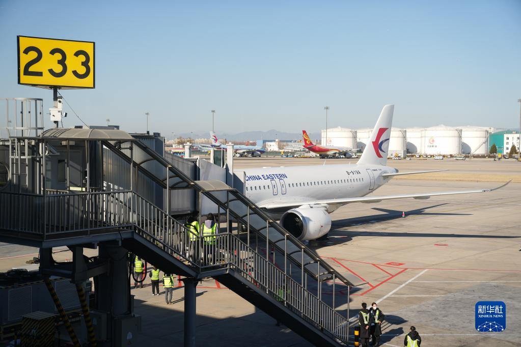 東航首架C919抵達北京首都機場(chǎng)(1月9日攝)。