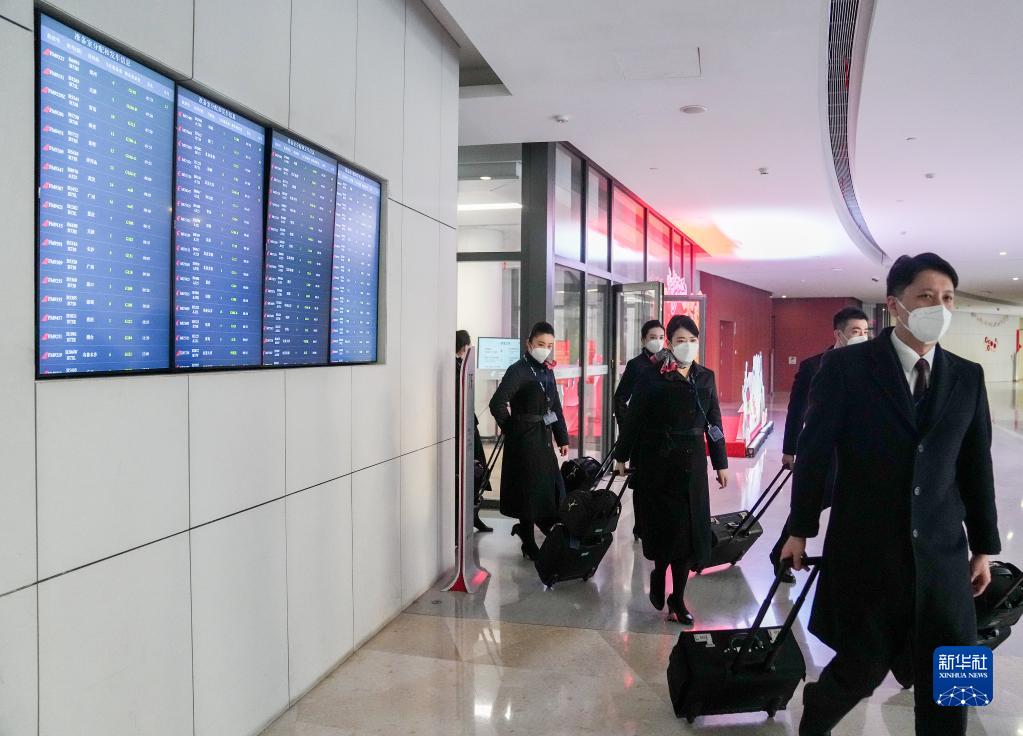 機組人員在東航工作區內行走,準備登機(1月9日攝)。