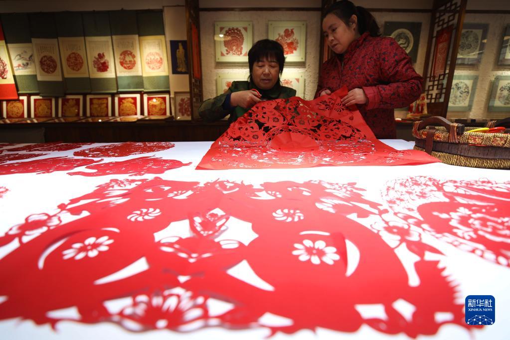 1月18日,在承德市雙橋區俊鳳剪紙創(chuàng )作室,剪紙藝人石俊鳳(左)創(chuàng )作賀歲迎春生肖兔主題剪紙作品。