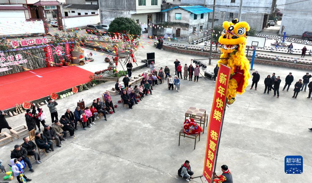 1月17日,村民在“村晚”活動(dòng)中觀(guān)看舞獅表演(無(wú)人機照片)。