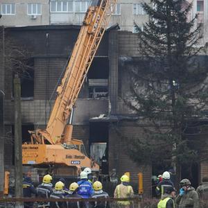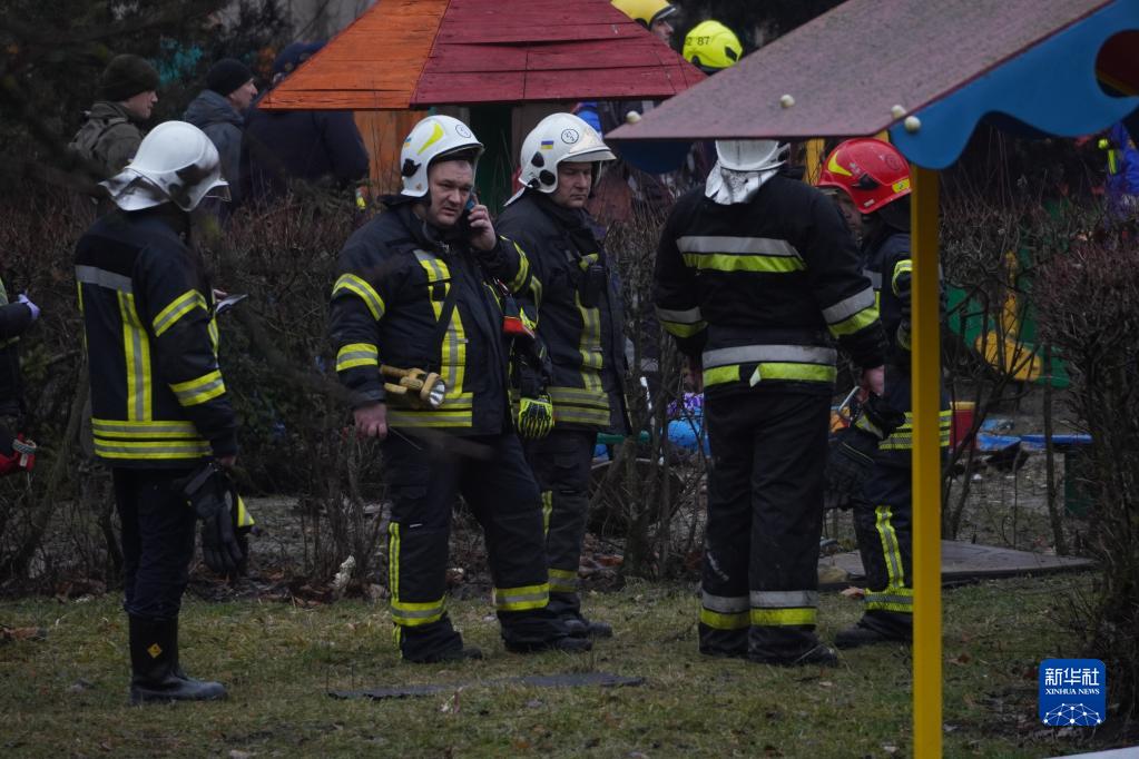 1月18日,烏克蘭國家緊急情況局工作人員在烏克蘭基輔市東郊布羅瓦雷的直升機墜機現場(chǎng)工作。