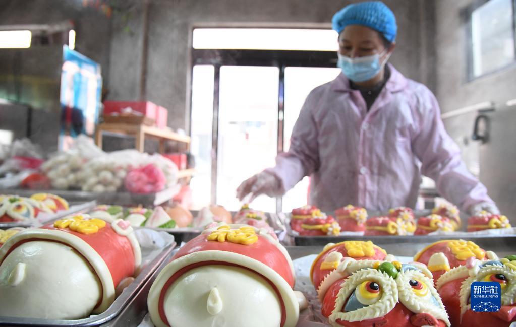1月19日,在河南省濟源市北海街道一處面點(diǎn)作坊,工作人員在擺放剛出籠的花饃。