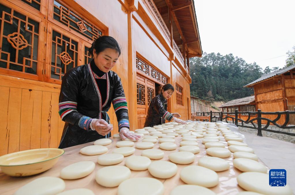 1月18日,貴州省黔東南苗族侗族自治州從江縣高增鄉占里村村民在制作糯米糍粑。糯米糍粑是當地侗族群眾過(guò)年必備的傳統食品,寓意團團圓圓。