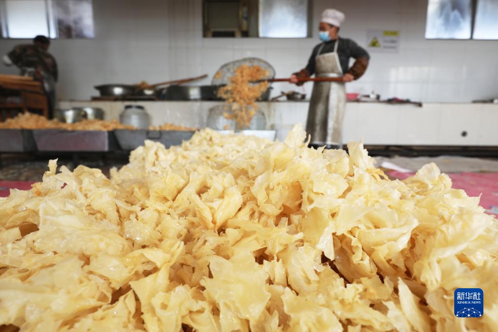 1月18日,在河北省唐山市豐潤區七樹(shù)莊村一家麻糖生產(chǎn)廠(chǎng),工人在車(chē)間里炸制麻糖以供應春節市場(chǎng)。