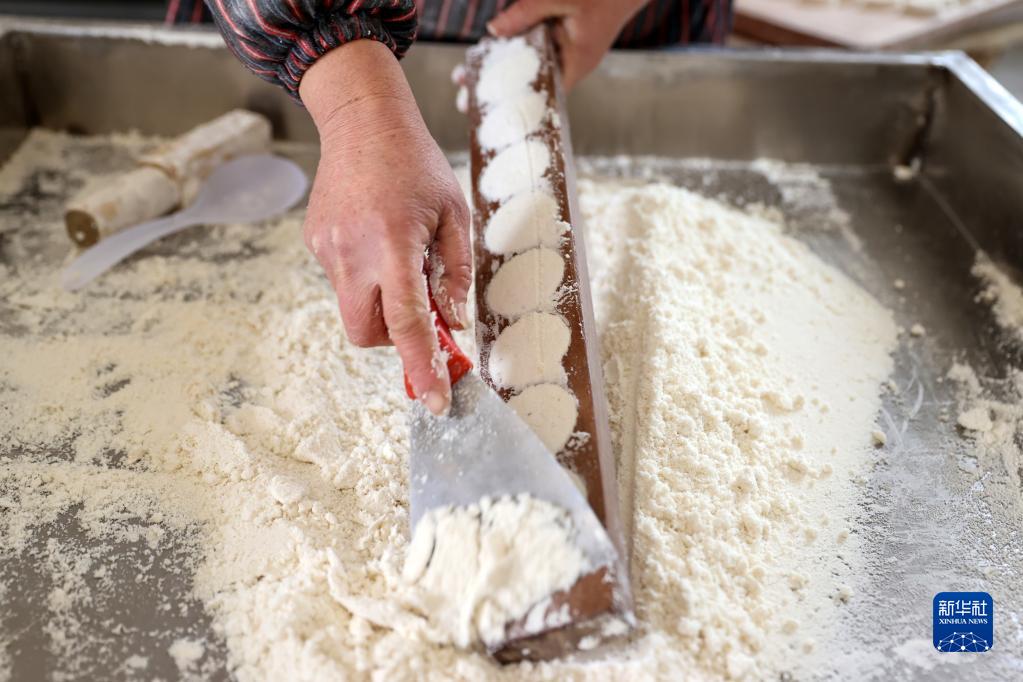 1月18日,貴州省遵義市務(wù)川仡佬族苗族自治縣丹砂街道桃符社區村民在制作當地特色點(diǎn)心酥食。制作酥食時(shí),先將糯米打成粉,再加入融化的白糖液揉搓至稍有黏稠感,然后將其壓入模具里輕輕敲動(dòng)、倒出,最后上鍋蒸熟即可。