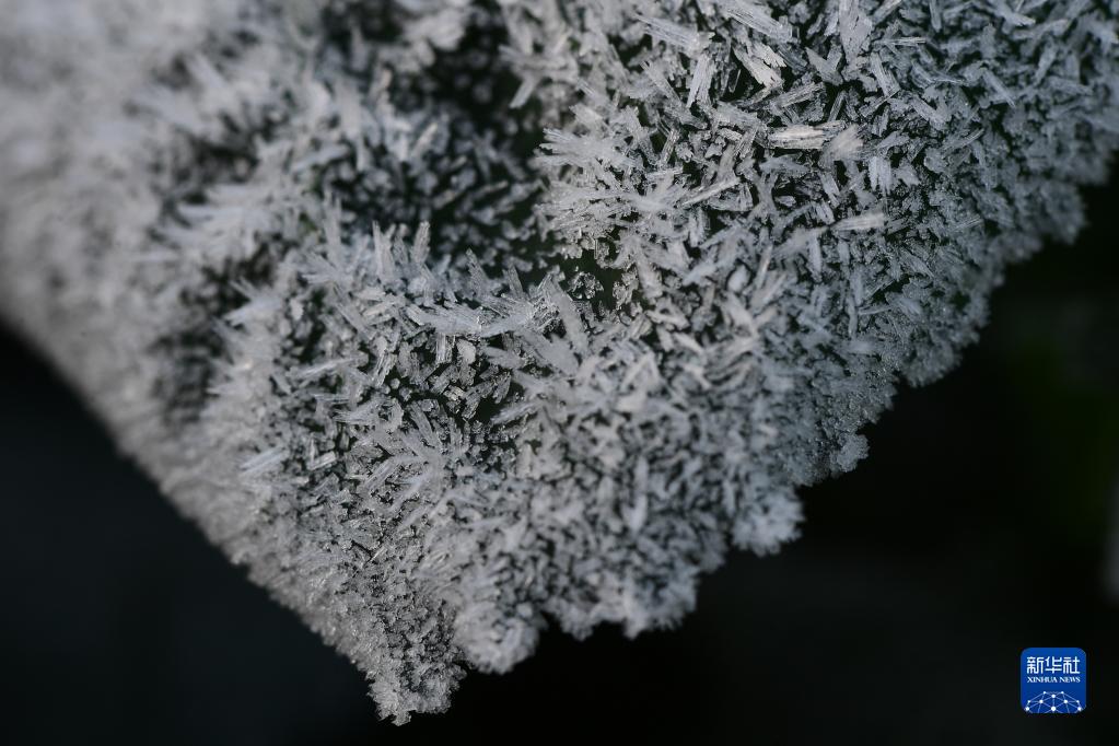 云南省曲靖市羅平縣金雞村,一片樹(shù)葉上鋪滿(mǎn)霜花(1月7日攝)。