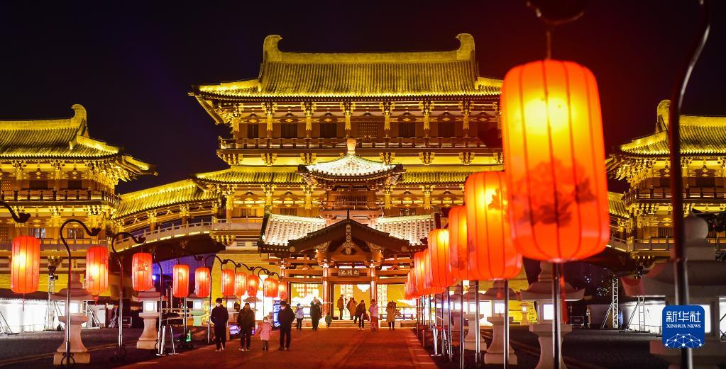 1月18日,游客在河南省洛陽(yáng)市隋唐洛陽(yáng)城九洲池遺址公園游玩賞燈。