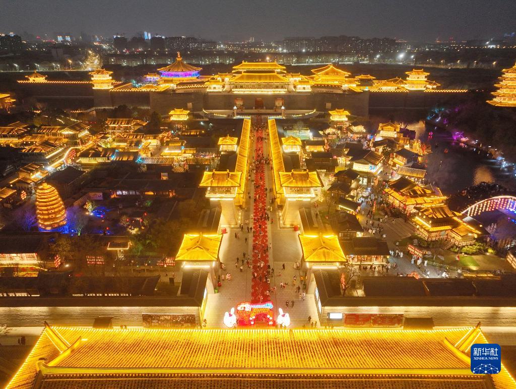 1月18日,游客在湖北省襄陽(yáng)市唐城景區游覽(無(wú)人機照片)。