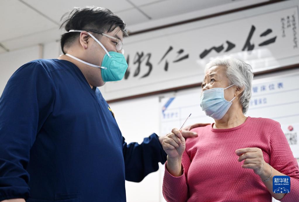 在天津醫科大學(xué)總醫院,劉洋(左)和一位老人交流(1月18日攝)。