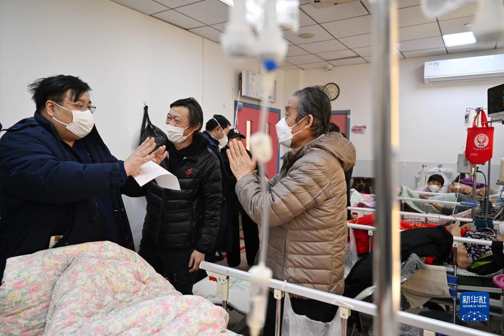在天津醫科大學(xué)總醫院,患者家屬雙手合十感謝劉洋(1月18日攝)。