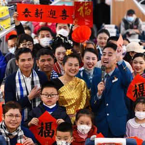 當日,奔馳在中老鐵路上的C272次列車(chē)車(chē)廂內,一場(chǎng)以“中老一家親,祥和中國年”為主題的列車(chē)春晚精彩上演。