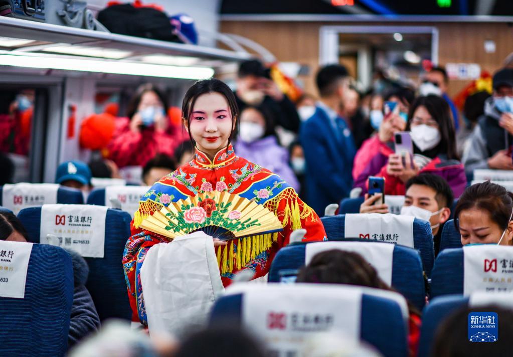 1月19日,京劇演員在車(chē)廂內表演《貴妃醉酒》選段。