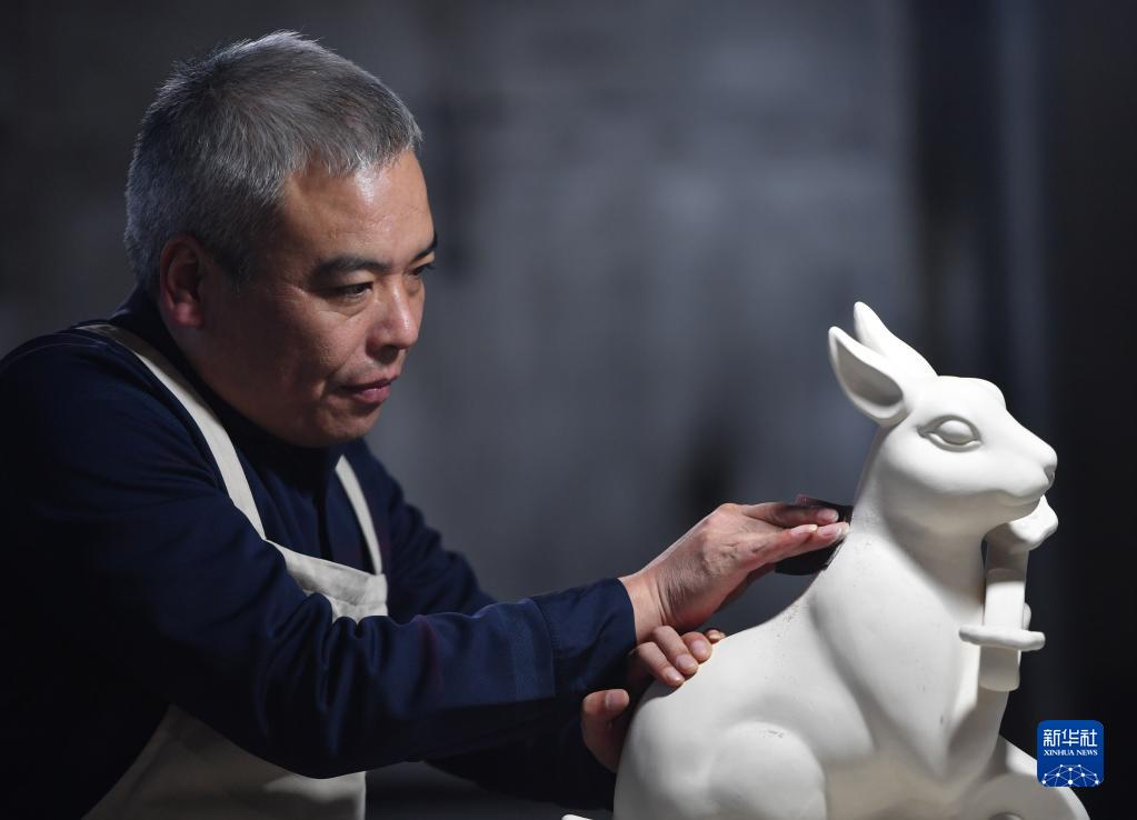 1月18日,在寶豐縣大營(yíng)鎮,汝瓷藝人王占穩在修飾汝瓷生肖兔素胎。