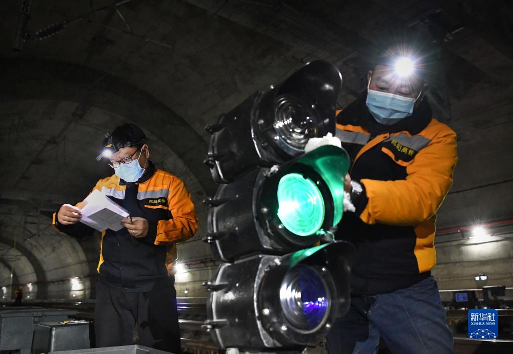 1月19日凌晨,鄭州高鐵基礎設施段作業(yè)人員在新鄭機場(chǎng)站北岔區保養信號機設備。