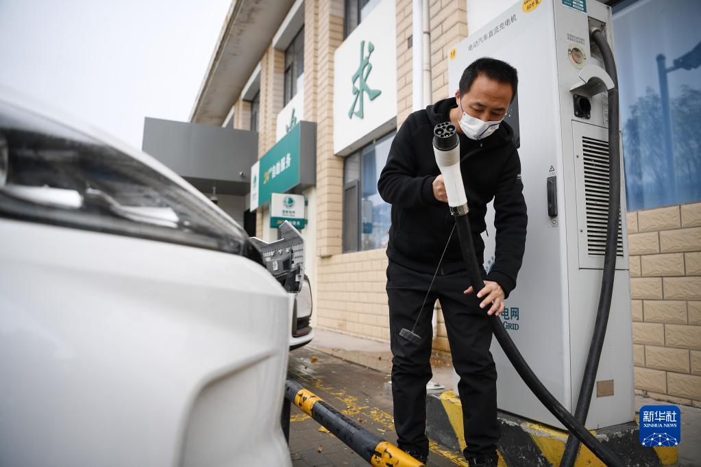 一名車(chē)主在國網(wǎng)寧夏電力石嘴山供電公司長(cháng)勝供電所充電樁為車(chē)輛充電(2022年11月11日攝)。