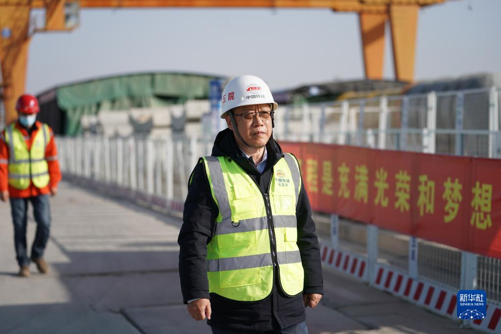 梅東冬在雄安新區至北京大興國際機場(chǎng)快線(xiàn)(R1線(xiàn))一標段項目工地巡查(1月18日攝)。