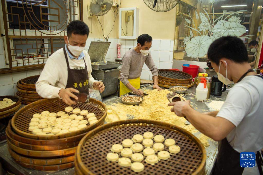 1月18日,澳門(mén)“最香餅家”員工在制作手工炭燒杏仁餅。