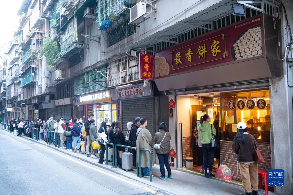 1月18日,游客在澳門(mén)“最香餅家”店外排隊購買(mǎi)手工炭燒杏仁餅。
