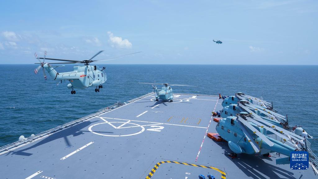 海南艦位南海某海域開(kāi)展登陸演練,艦載直升機進(jìn)行連續多波次起降訓練(資料照片)。
