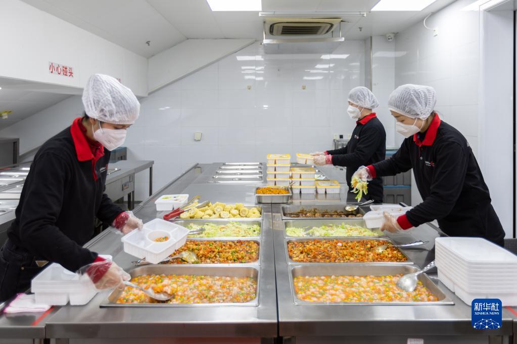 1月19日,工作人員在打餐間分裝餐食。
