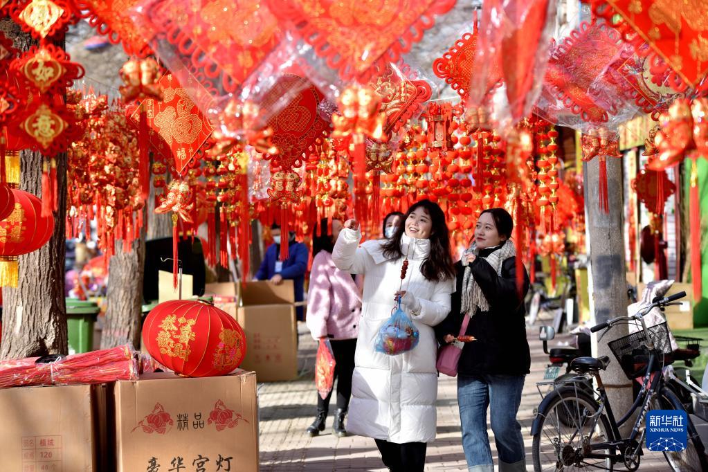 春節將至,在河北省邢臺市南和區的年貨集市,不少市民選購節慶飾品、春聯(lián)、福字等年貨,迎接新春佳節的到來(lái)。