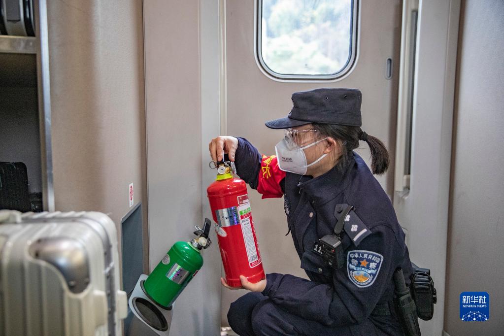 1月16日,在貴陽(yáng)北開(kāi)往西安北的D1703次列車(chē)上, 重慶鐵路公安處乘警支隊“芳華”女子乘務(wù)警組的朱小麗在查驗列車(chē)消防器材。