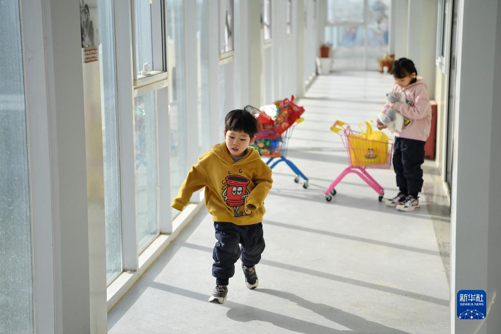 1月18日,李輝的兒子和女兒在樓道內玩耍。