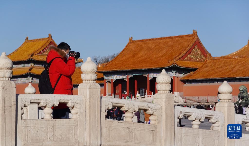 春節前夕,不少游人來(lái)到北京故宮博物院,在藍天暖陽(yáng)下感受冬日故宮的獨特韻味。
