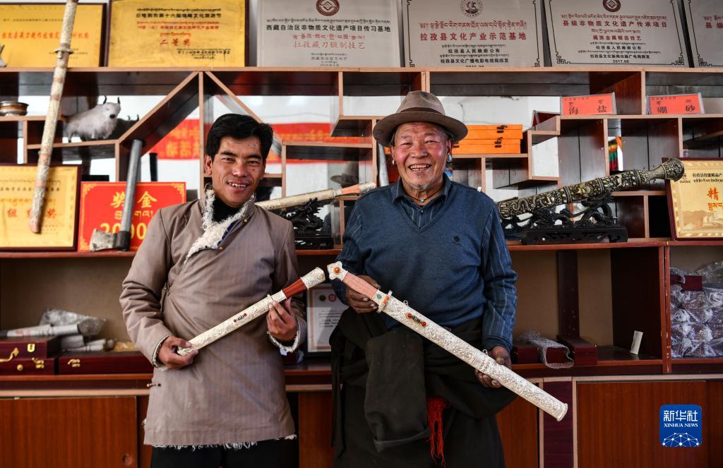 普達瓦(右)和兒子多吉占堆一起展示制作好的拉孜藏刀(1月19日攝)。