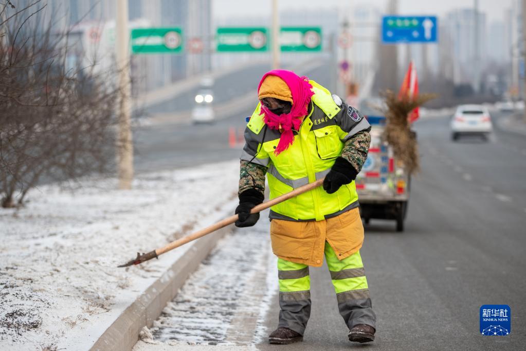 1月21日,在黑龍江省哈爾濱市道里區,環(huán)衛工李曉琴清掃街道。